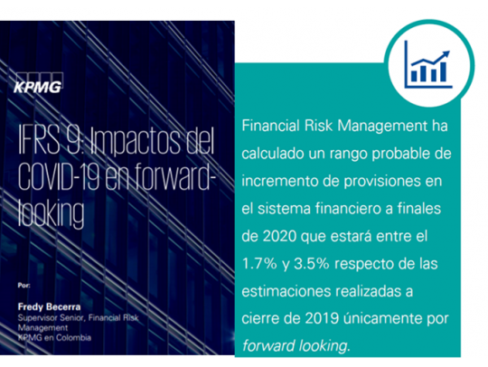 En su informe, liderado por Fredy Becerra, Supervisor Senior del equipo de Financial Risk Management , KPMG comparte su estimación del efecto de forward-looking en la banca colombiana con base en los escenarios Macro de sus cálculos, que arrojan un rango probable de incremento de provisiones en el sistema financiero a finales de 2020 que estará entre el 1.7% y 3.5%, respecto a las estimaciones realizadas a cierre de 2019, únicamente por foward looking.