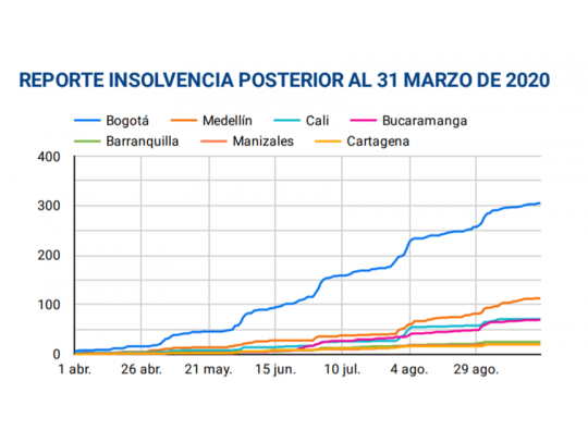 En total,  con corte al  24 de septiembre, la Superintendencia de Sociedades ha recibido durante el año 2020, 852 solicitudes de insolvencia, 624 de ellas, durante el 1 de abril y 24 de septiembre, es decir durante la pandemia. Los sectores servicios y comercio, concentran más del 50% de las solicitudes.  A su vez Bogotá reúne casi la mitad .