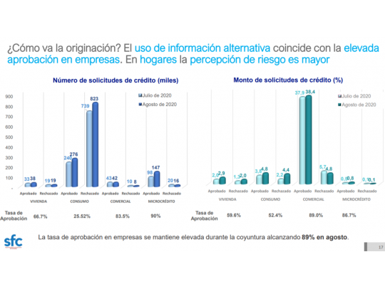Tasa de aprobación en agosto del 2020: Vivienda 66.7%; Consumo 25.52%; Comercial 83.5% y Microcrédito 90%.