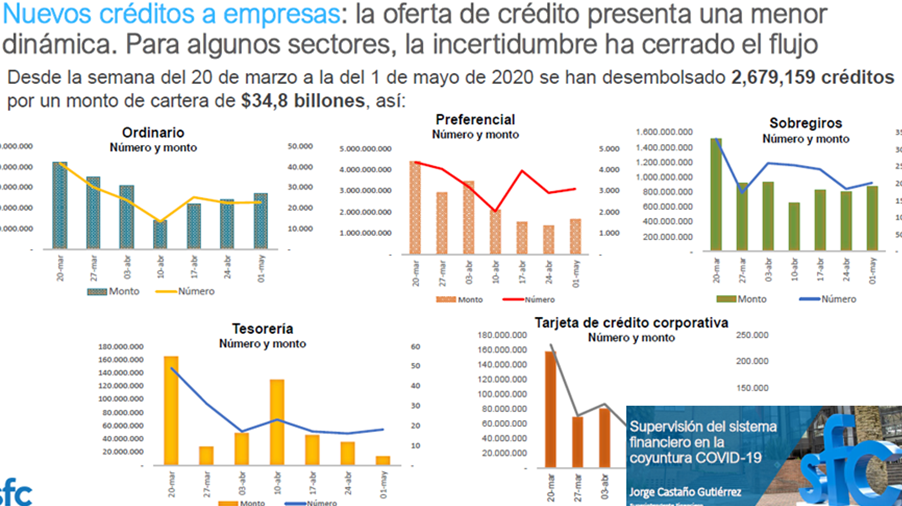 Ante el constante reclamo del sector empresarial sobre una mayor ayuda del sector financiero en la crisis, el Superintendente presentó un reporte con el alcance de los beneficios ya otorgados por las entidades crediticias, los que  al 8 de mayo han cubierto a 8.656.379 deudores (personas naturales y jurídicas) con 10.789.202 créditos por un saldo de cartera de $177,94 billones.
